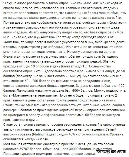Дополнение к отзыву от 30 ноября 2019 годаСегодня я обнаружил, что moemnenie.ru по-тихому аннулировал мой аккаунт со всеми накопленными баллами. Никаких предупреждающих писем я не получал.Покопавшись в Пользовательском соглашении я обнаружил примечательный абзац: "Пользователь согласен с тем, что МоеМнение оставляет за собой право прекратить регистрацию Пользователей, которые не приняли участия ни в одном из опросов, проводимых МоеМнение, в течение 3 (трех) месяцев(!!!), .... При этом персональная информация Пользователя уничтожается, а накопленные Пользователем баллы аннулируются." То есть, меня лишили набранных баллов на вполне законных основаниях. Вот и решайте: оно вам надо? Но я, однако, зарегистрировался вторично - ведь я пытаюсь мониторить все платные опросники Рунета. Отзыв о moemnenie.ru от 8 апреля 2023После февраля 2022 года на опроснике "установилась тишина", приглашений на опросы в марте-апреле почти не было. Начиная с марта число опросов начало расти и к к началу 2023 их было если и не больше, чем до известных событий, но гораздо больше, чем у многих других платных опросников. Вот некоторые мнения авторов отзывов: